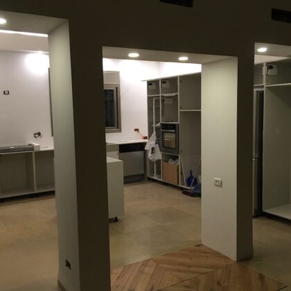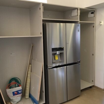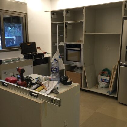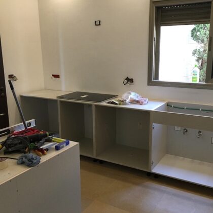 La précédente cuisine datait de 20 ans, elle était encore robuste, mais le souhait de la cliente était de moderniser cet espace, en ouvrant la pièce vers le salon, en mettant un ilot central, ... Les travaux ont consisté à : enlever toute la cuisine existante, réparer les murs, tout repeindre, installer un nouveau système de lumières, réaliser les plans de la cuisine (meubles, électroménager, ...), travail de menuiserie, choix de l'électroménager avec frigo américain, plaques haute qualité, ..., installation, ouverture de la cloison vers le salon, installation d'un panneau de beau bois au sol, choix et installation du marbre, finitions.